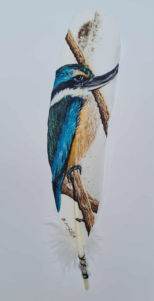 Beth McGill- Kingfisher (Kotare) Painted on a feather and presented in a white box frame and protected with glass. Measuring 200x400mm $445-00