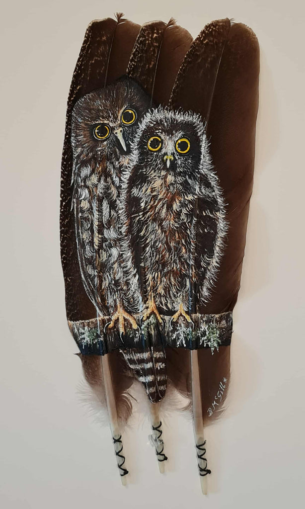 Beth McGill-Morepork Ruru Love. Painted on a feather and presented in a white box frame and protected with glass. Measuring 300x450mm $649-00