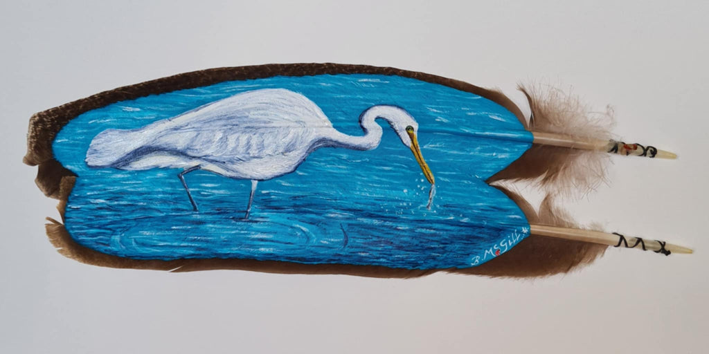 Beth McGill-White Heron.Painted on a feather and presented in a white box frame and protected with glass. Measuring 300mm x 450mm $649.00