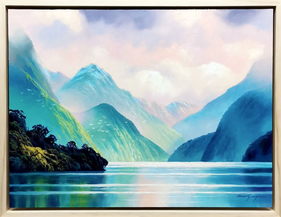 Blair Greig-Light and shadows, Fiordland ,oil on panel framed size 330 x 430mm $2450-00