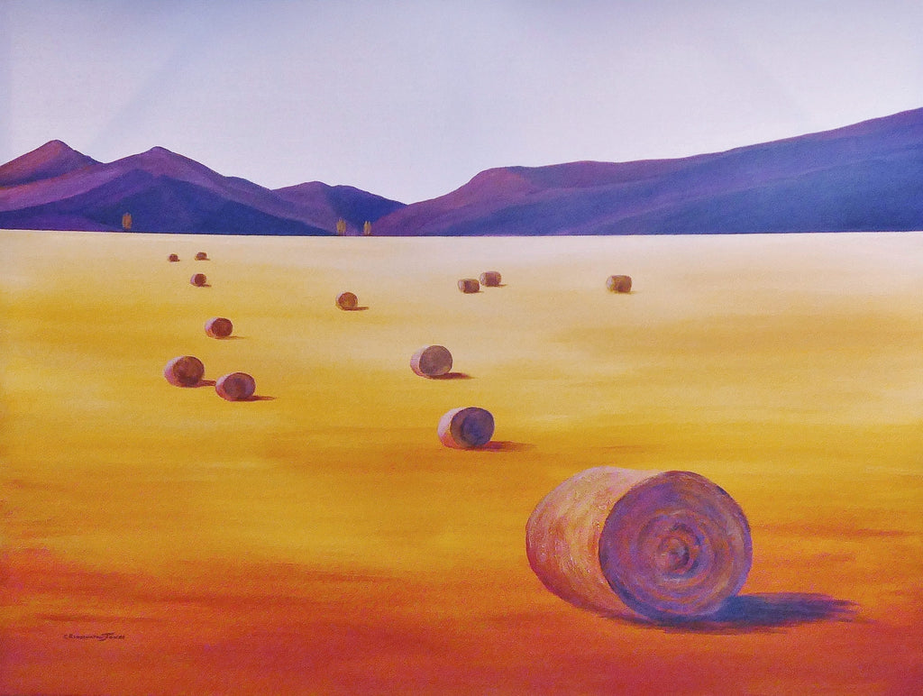 This vibrant painting was inspired by the beautiful golden grasses and the hay bales as I was driving home one afternoon. The scene couldn’t have been better, with golden fields and the mountains in the background. I have used texture on the hay bales and a softer touch in the distance. It would be a very striking addition to any room.