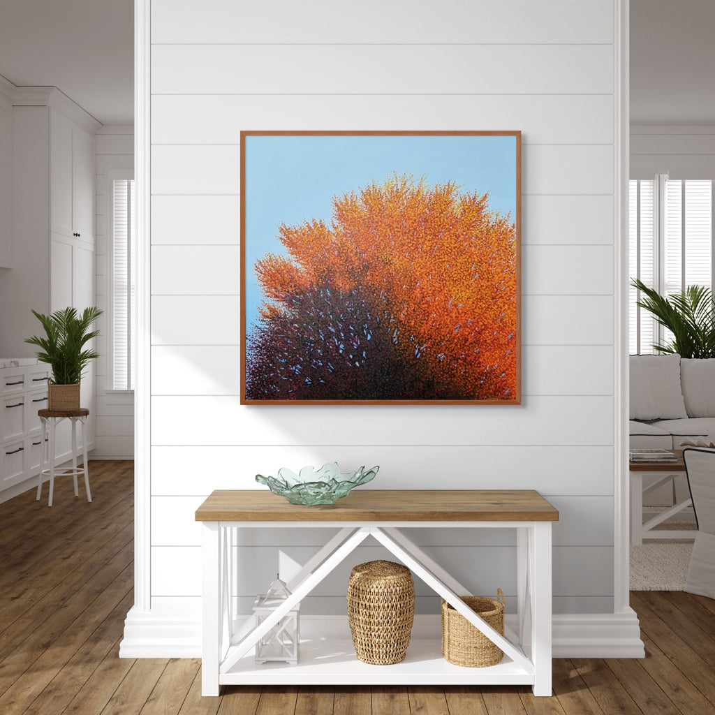Inspired by a late afternoon walk, this painting captures the last light hitting a tree and setting its orange foliage on fiery display.