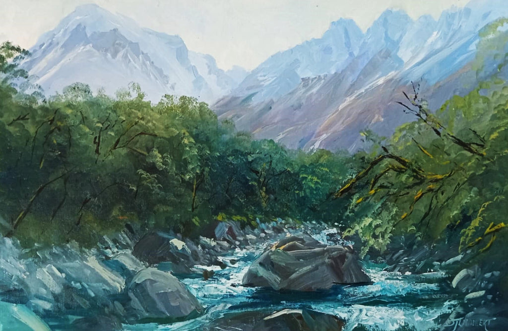 Deborah Lambert-The Tutoko and Darren Mountains.Oil on the unstretched canvas measuring  395mm x 610mm $1500.00