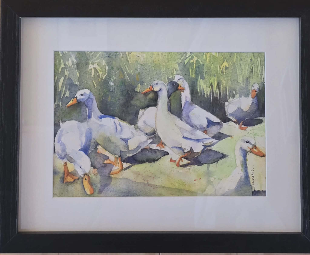 Jane McIntosh-Feeding Time,Peking Ducks' ,Watercolour,framed black, 520x410mm $725-00