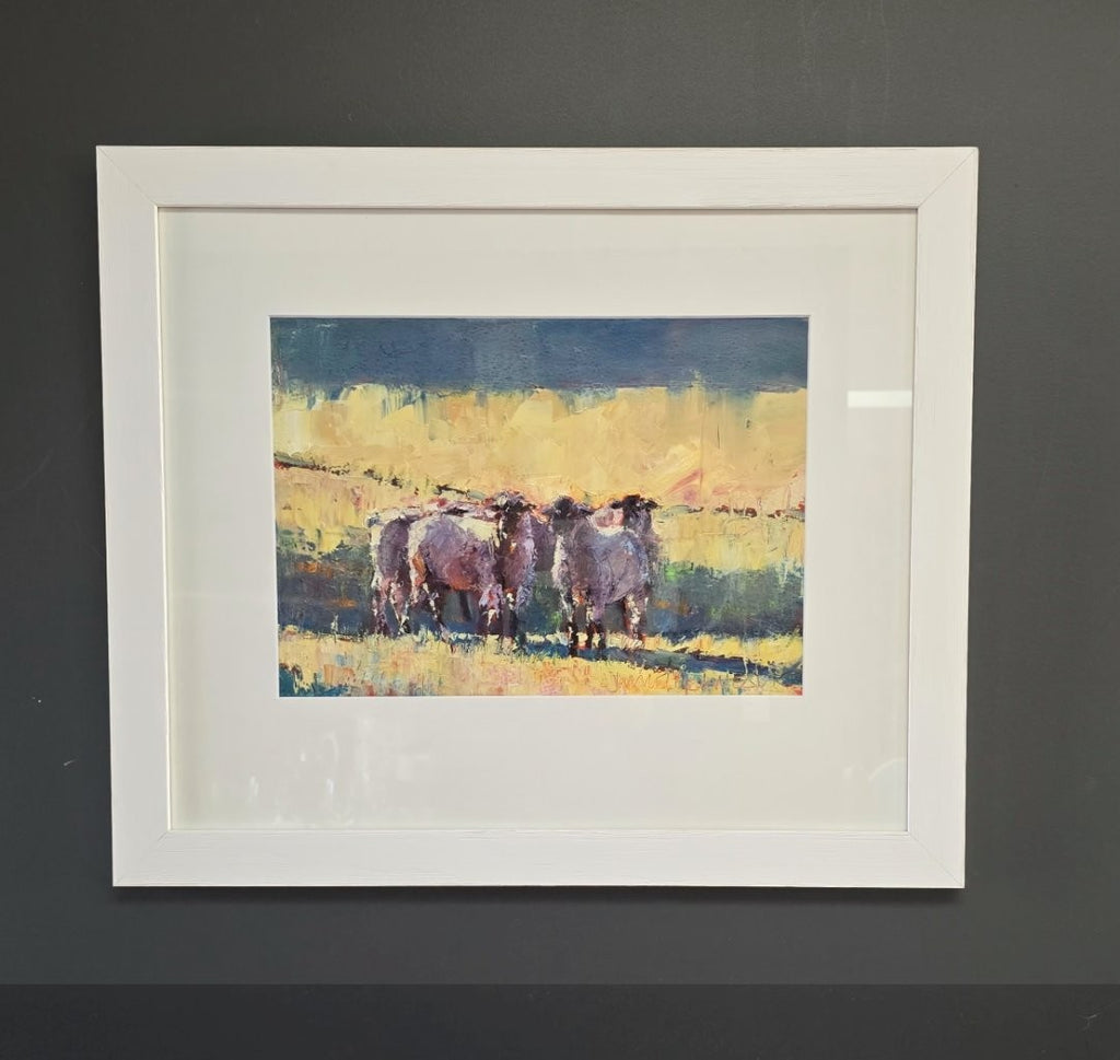Jane McIntosh-Stud Suffolk Rams. Early Morning. Oil on paper behind glass. Framed.