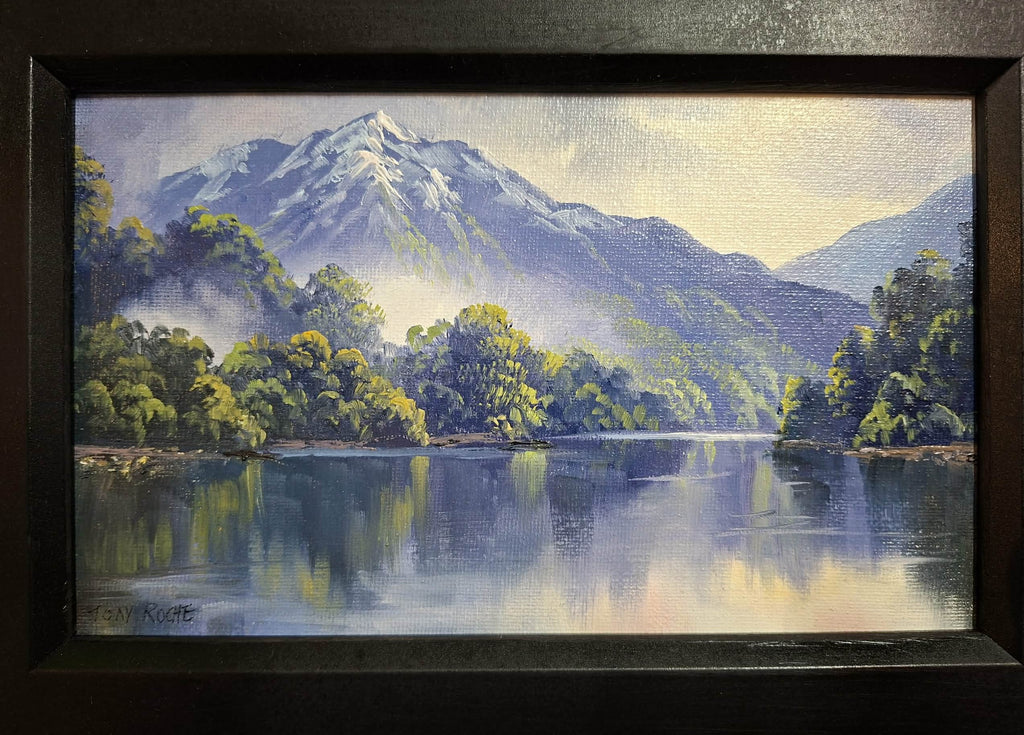 Tony Roche-Lake Manapouri Fiordland. Oil on canvas, Framed size 190 x 275mm $695.00