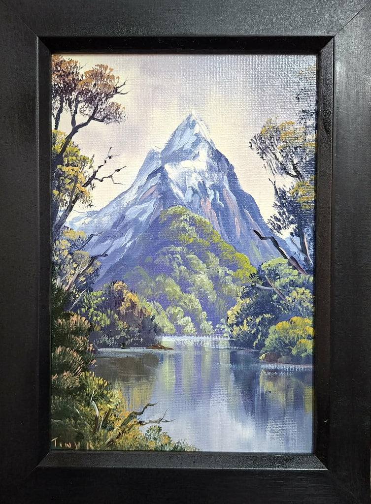 Tony Roche-Mitre Peak before the rain Oil on canvas, Framed size 200 x 275mm $695.00