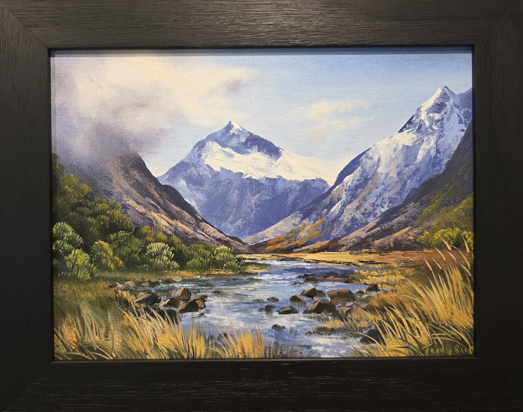 #316 Tony Roche- Mt Talbot, Hollyford River . Oil on canvas framed measuring 300x 370mm $995.00