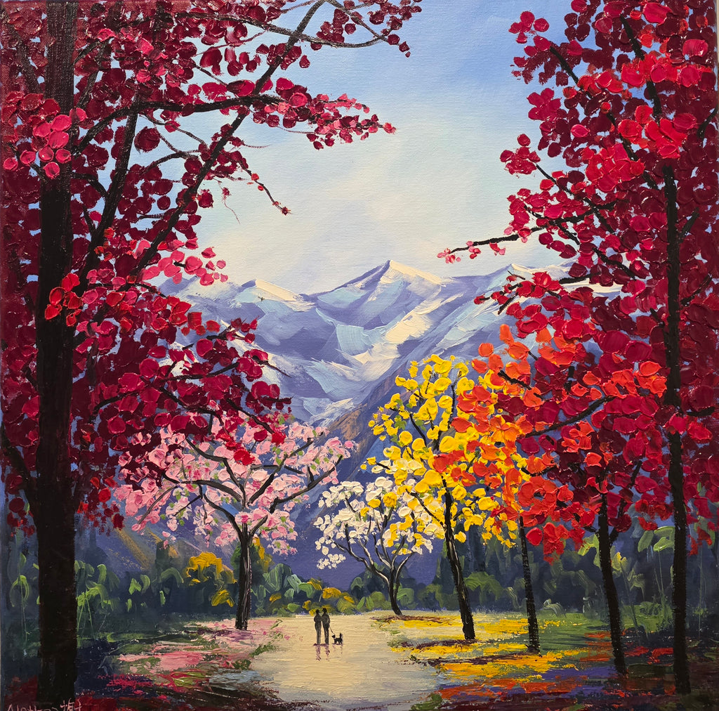 Alethea Roche-Walking the dog in Queenstown.. Impasto oil on the wrap around canvas measuring 500 x 500mm $995.00 #386