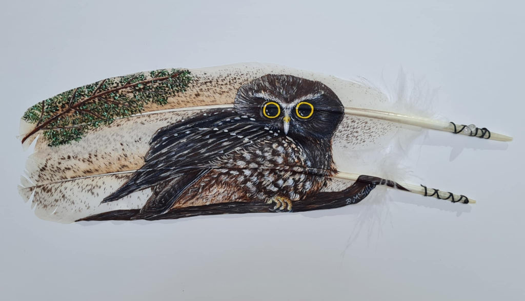 Beth McGill-.Baby Morepork.Painted on a feather and presented in a white box frame and protected with glass. Measuring 300mm x 450mm $649.00