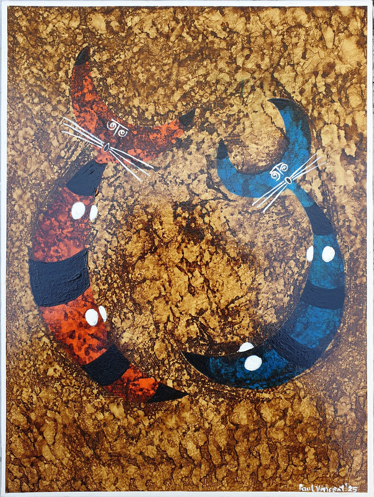 Paul Vincent-Cat Dancing. Mixed media on the box canvas measuring 300 x 400mm $400.00