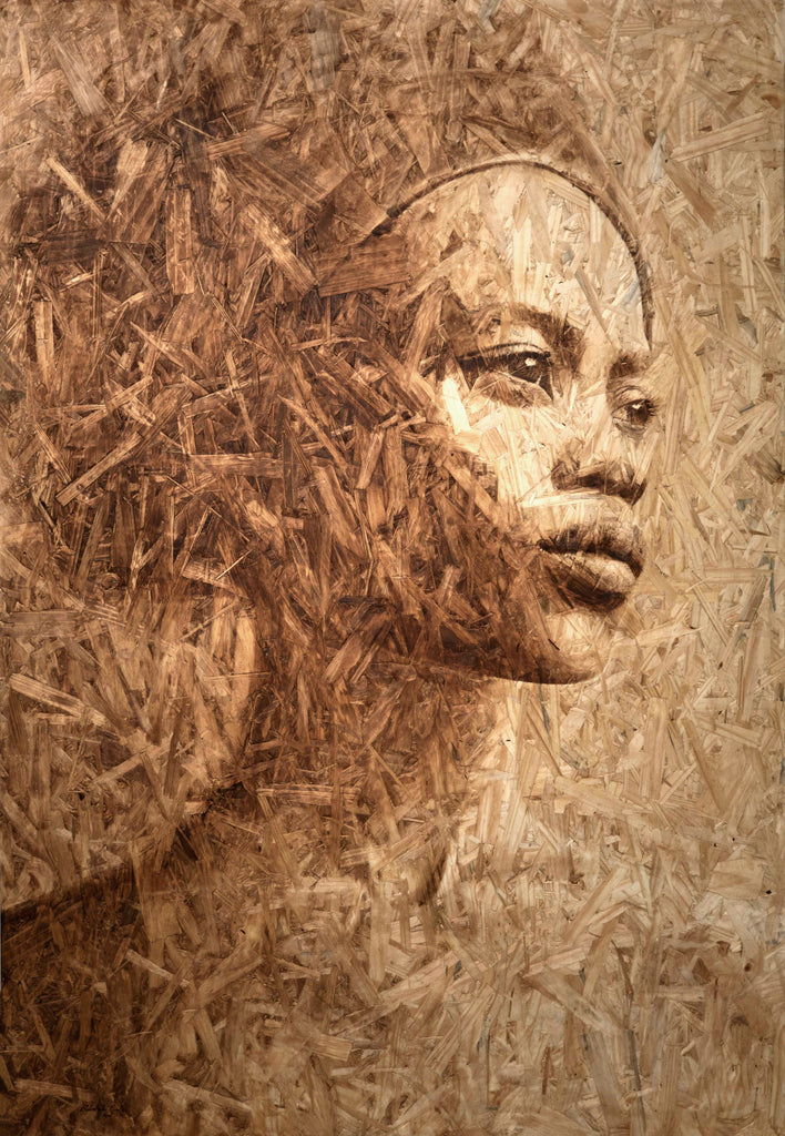 Each wood chip is carefully tinted with varying shades of translucent oil paint to create a serene and powerful portrait that emerges from the chaos of wood chips. The process of painting on this medium is such that there is no room for error. Once the oil paint has stained the wood it cannot be removed or layered over, therefore each stroke is very deliberate