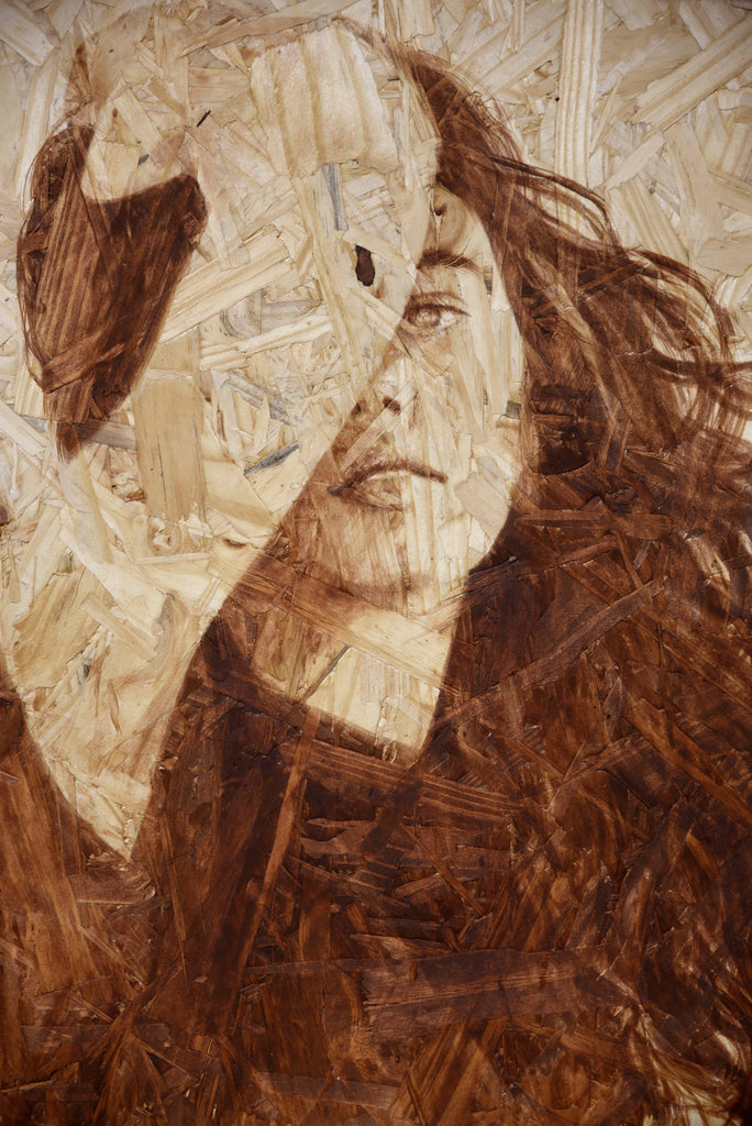 Each wood chip is carefully tinted with varying shades of translucent oil paint to create a serene and powerful portrait that emerges from the chaos of wood chips. The process of painting on this medium is such that there is no room for error. Once the oil paint has stained the wood it cannot be removed or layered over, therefore each stroke is very deliberate